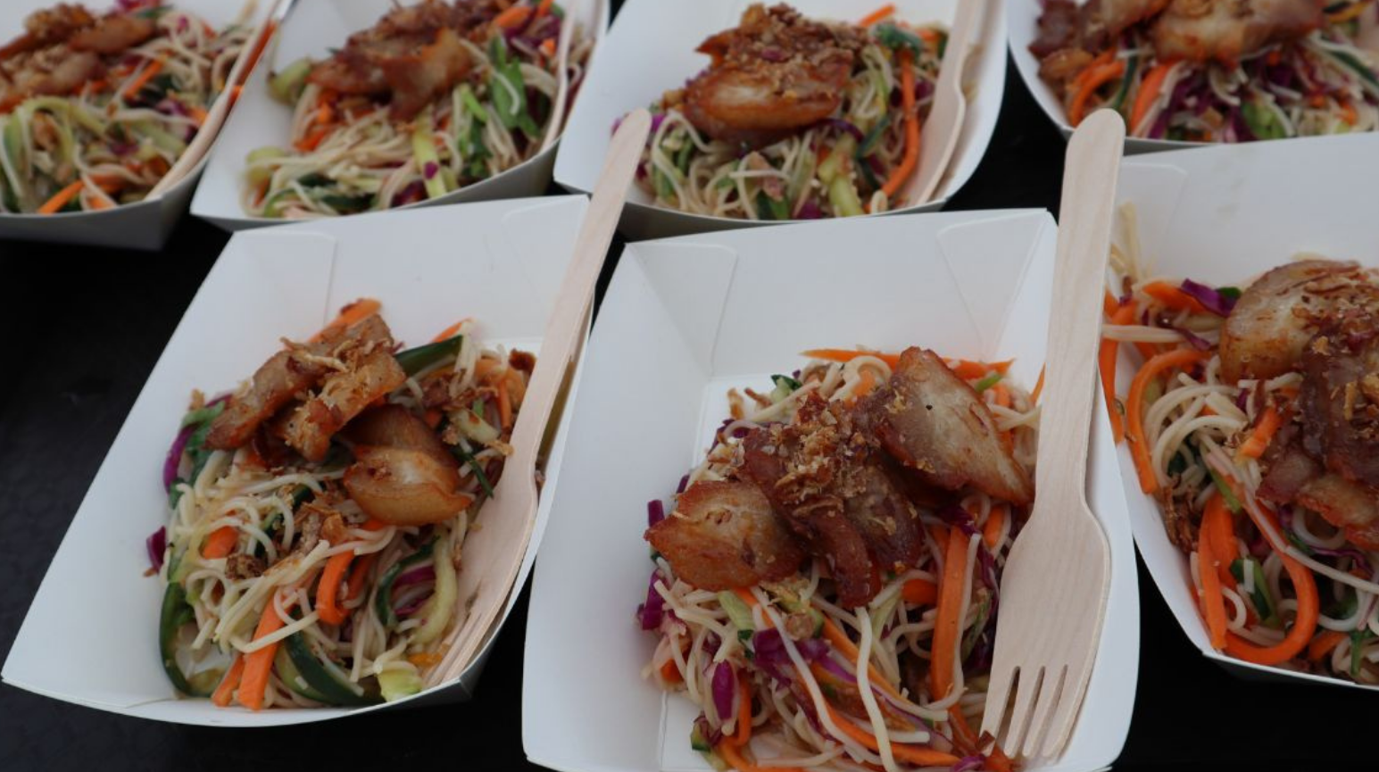 - Crispy pork belly and salad boxes.