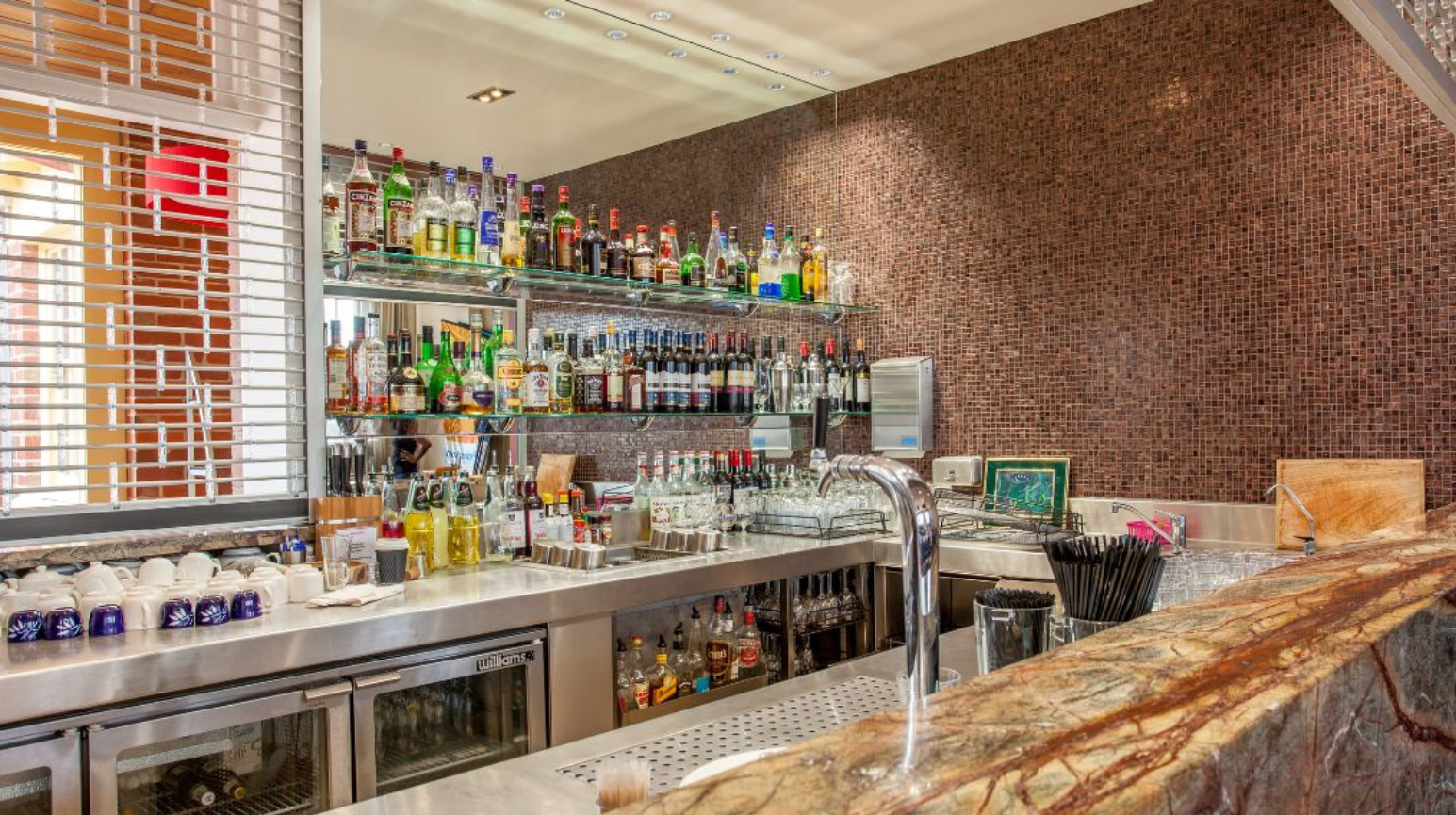 The restaurant is perfect for cocktail parties or formal sit‑down dining events of up to 90 guests. The venue is also equipped with a modern audiovisual system and two screens.