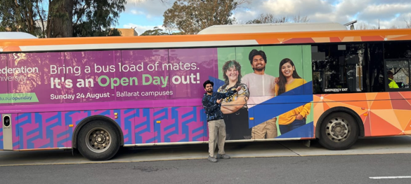 Vashista proudly standing in front of a Ballarat bus featuring him and friends.