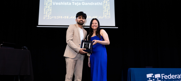 Vashista accepting his award as Federation University's Student Leader of the Year for 2025
