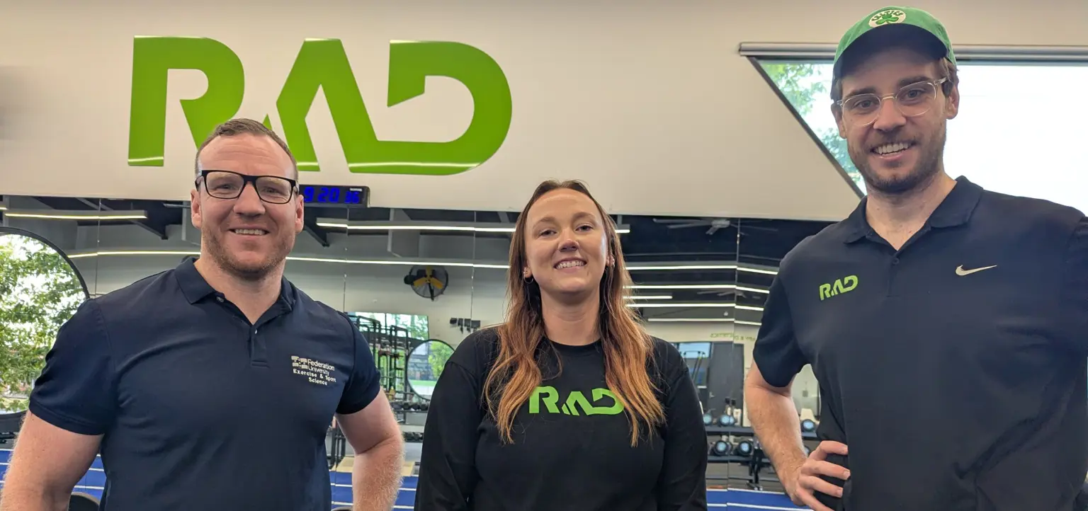 Federation University Exercise and Sport Sciences Lecturer Dr Mathew O'Grady, PhD student and RADCENTRE strength and conditioning coach Madison Sanford and RADCENTRE head of performance and education Tim Welsh. Image: Supplied